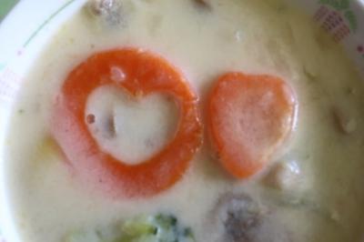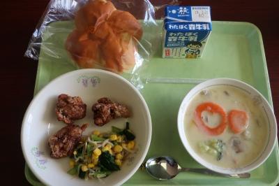 今日のオリジナルメニューは、6年2組の大川凜桜さん、岩舘結桜さんが考えた給食です。ほっこりシチューで温まり、唐揚げやチーズパンでかぜに負けない元気な体づくりをめざしたメニューです。パンは、パン屋さんが今日の日のためにつくってくれた素敵なパンです。シチューの具材のにんじんがハート型でした!