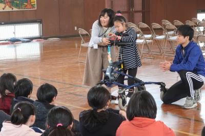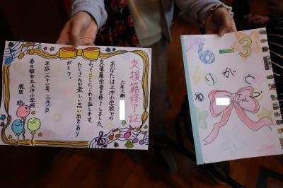 送る会に参加した宮代特別支援学校のお友達が、終了後、6年生とお別れをしました。6年3組の児童がつくった、世界に一つしかない手作りの支援籍修了証とプレゼントを渡しました。支援学校のお友達からは、メッセージと花束をいただきました。こちらも心温まる出来事でした。