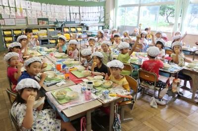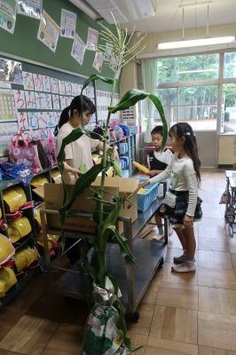 今日の給食のメニューに登場した「ゆでとうもろこし」。実は、1年生が1時間目に皮をむいてくれたとうもろこしです。とうもろこしには、雄と雌の部分があり、雌の部分が実となっていくこと。ヒゲみたいな数だけ、とうもろこしの実ができることなど、たくさん勉強しました。そして、給食に時間に、みんなでおいしくいただきました。