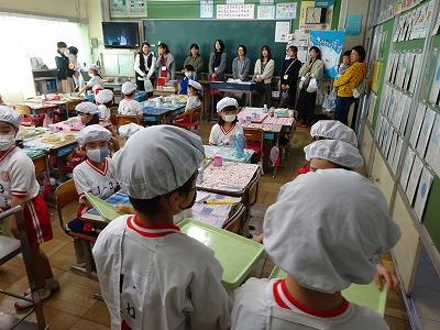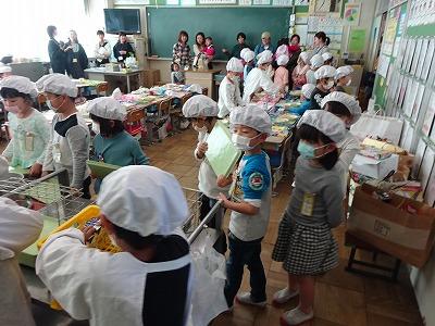 1年生の学年行事「給食試食会」が行われました。体育館で本校の石崎栄養教諭の講演の後、1年生の給食の配膳の様子を見学し、6年生の教室で給食を食べました。今日のメニューは、「焼きそば、牛乳、さつまいものタルト、切り干し大根のサラダ」でした。