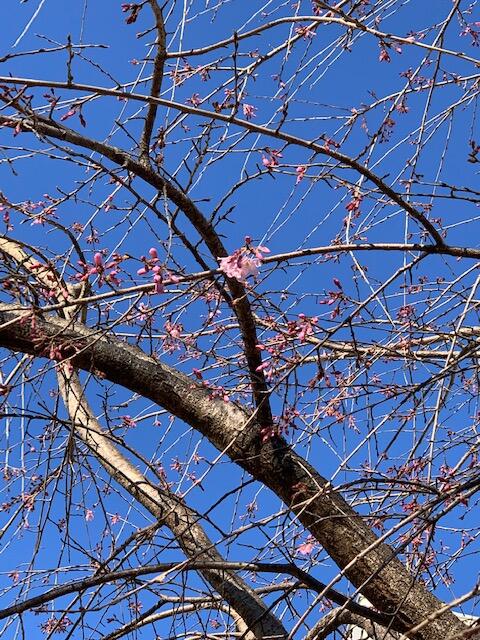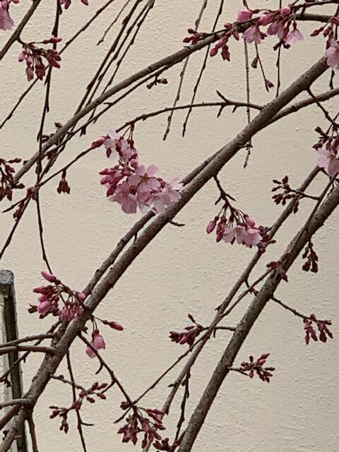 職員玄関付近にある、しだれ桜が咲き始めました。春がそこまで、きています。