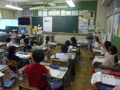 外国語活動の時間を1年生が行っています。1問1答形式で英語で会話していきます。