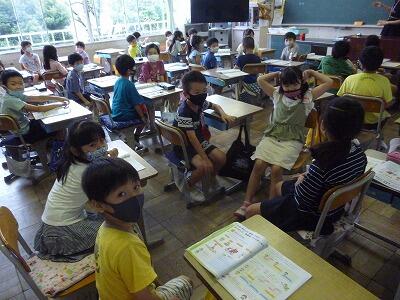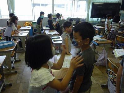 2年生の音楽の授業では、セミの鳴き声を使って音楽を作ります。体全体で表現し、楽しく友達と曲をつくっていました。
