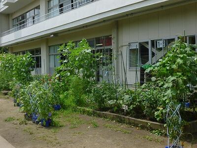 学校の1,2年生の学級園も収穫を迎え、ミニトマトやキュウリ、ししとうなどの夏野菜も収穫できました。