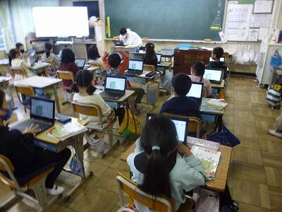 教室では、タブレットを使った授業が多く見られています。漢字の書き順を覚えながらなぞり書きをしたり、ドリル学習、調べ学習などいろいろことに使っています。