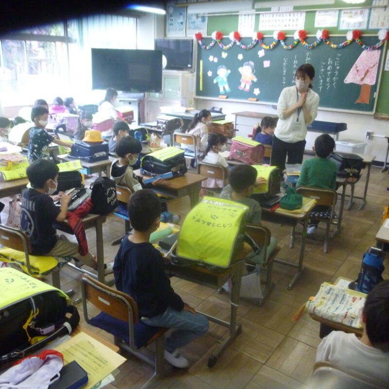 1年生が初めて自分の教室に入り、学校生活をスタートしました。6年生が優しくお手伝いをしてくれていて、とても温かい気持ちになりました。