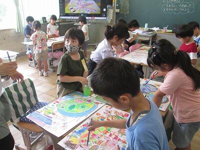 こどもたちは、筆を使って、丁寧に色を付けました。