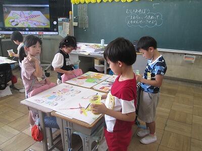 校内絵画展に向けて、1年生が、「むしとあそぼう」の絵を描いていました。