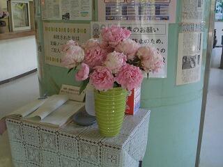 現在、本校の玄関を入ったところのスペースに写真のような見事な芍薬(しゃくやく)の花が飾られています。
