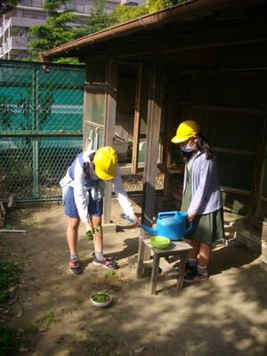 担当の栽培委員が職員室前のお花に水をあげてくれています。