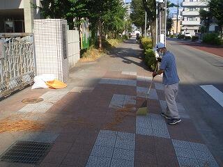 植物への水やり、落葉(?)の掃き掃除をする本校職員の姿です。