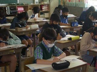 「書写」4年生になって初めての習字の授業。墨をこぼさないように少し緊張気味でした。