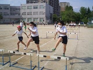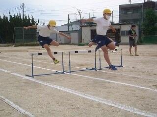 朝の時間に、陸上大会へ向けて練習に励んでいる6年生によるこれまでの練習成果の発表と