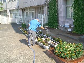 気温が上がらない時間帯に職員が植物への水やりをしています。