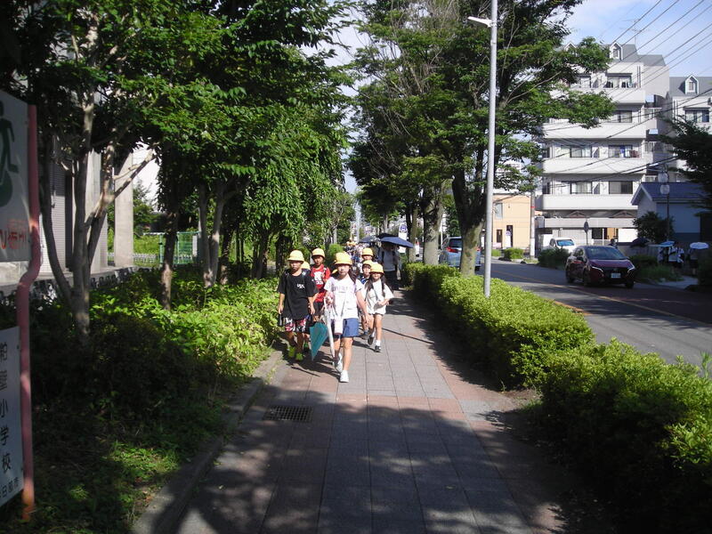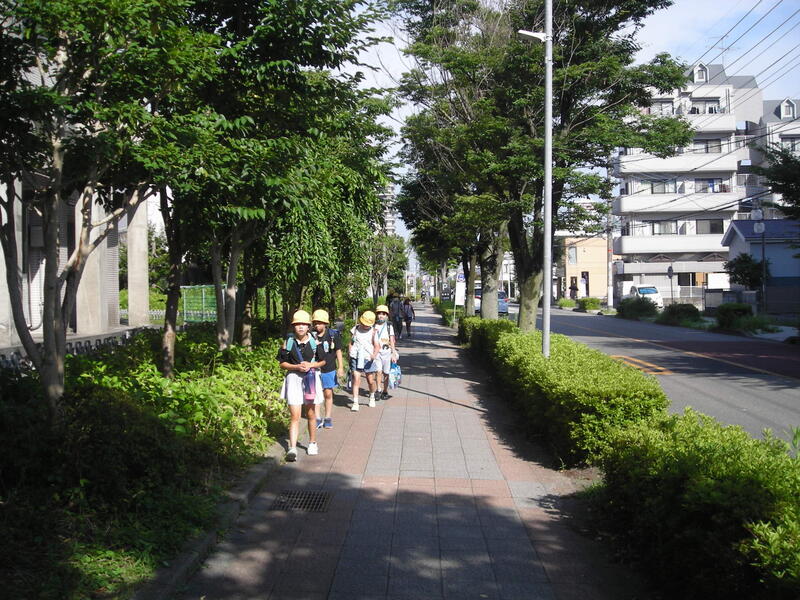 朝からの暑さの中ですが、歩道を占有せず登校しています。