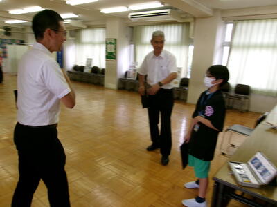 学校にはこどもたちを始め、保護者の方、PTA執行部の方、地域の方など多くの方々が毎日来ています。時には配送業者の方や施設設備の点検に来る方もいます。そんな中、今日はミシンの点検とプールの水質検査のために、業者の方が来てくれました。こどもたちが安全に学習できるよう、教員以外にも様々な人が様々な形で学校教育に関わってくださっています。ちなみにミシンは点検完了、プールの水質は問題なしです。