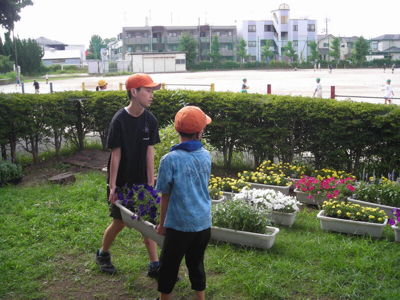 夏休みを前にして、栽培委員のみなさんが、少しでも日が当たらないところにプランターの花を移動しました。