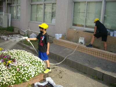 担当の栽培委員が職員室前のお花に水をあげてくれています。