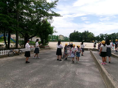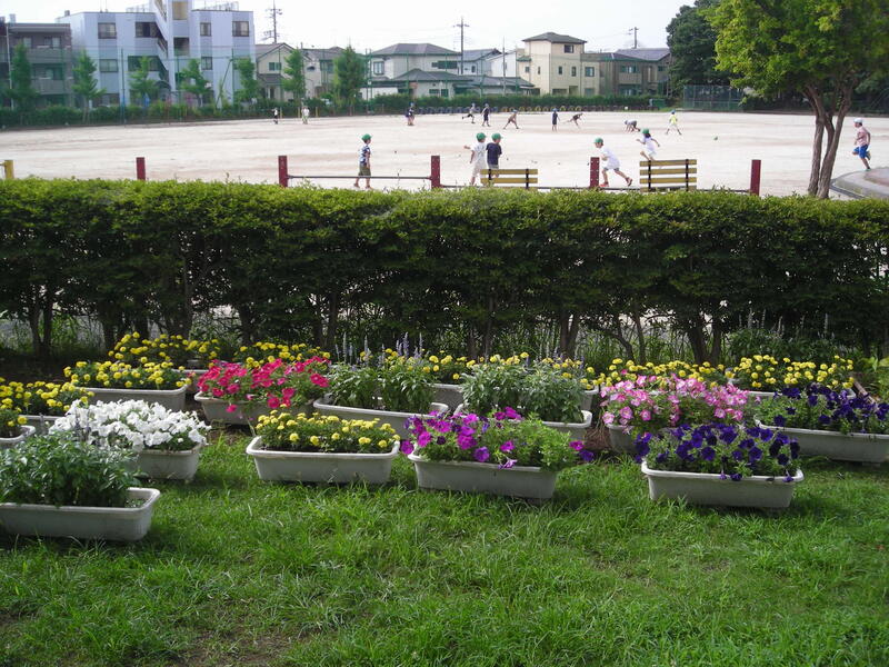 夏休みを前にして、栽培委員のみなさんが、少しでも日が当たらないところにプランターの花を移動しました。