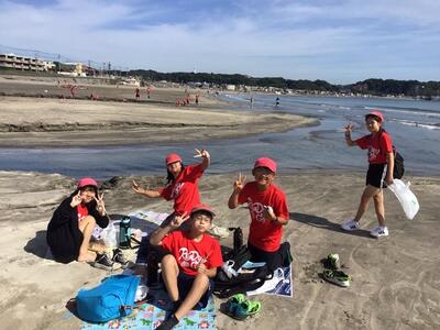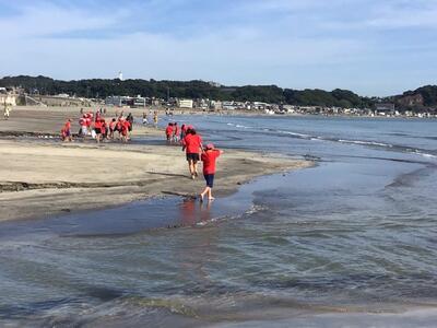 由比ヶ浜に来てみると、たくさんの赤いシャツを着たこどもたちが目を輝かせ、