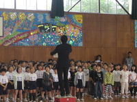 | 『朝会』 ② お話朝会・・・校長先生+先生のお話を聞きます。今日はどんなお話かな? ③ 音楽朝会・・・今月の歌を歌ったり、学年の音楽発表を聴きます。 入退場の音楽は音楽委員会が演奏してくれます。 ④ 児童集会・・・集会委員会が計画をたてて朝会を進行します。 学年をまたいでチームを作ってゲームをする事もあるよ。 |