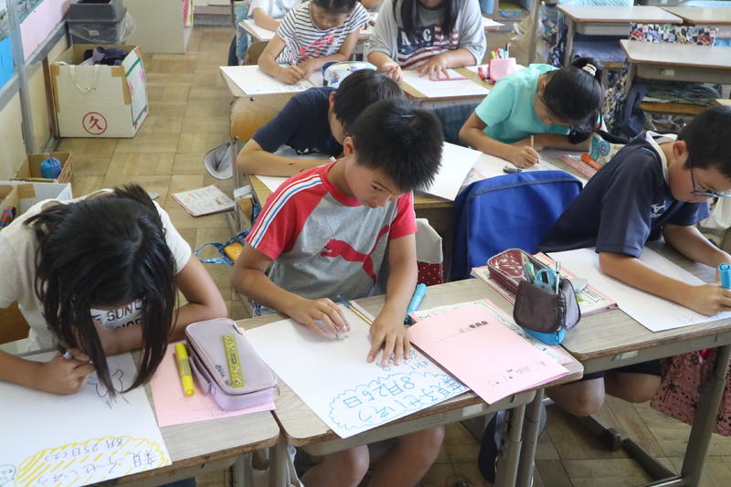 粕壁小学校の掲示物を作っています。粕小のみんなが掲示物を見て喜んでもらえるようにがんばります。