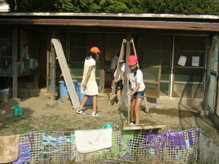 うさぎ小屋の掃除をしたり、世話をしたりしています。かわいいうさぎのためにがんばっています。