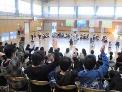 続いて2年生の登場です。2年生からは、卒業する6年生に、川辺小に関する三択クイズが出題されました。川辺小の児童数や教室の数、2年生で習う漢字はどれかなど、意外と6年生の答えが分かれるいい問題でした。