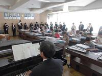 ウォーミングアップを兼ねて、みんなで校歌を歌ってから、今月の歌の「離任式の歌」を合唱練習しました。