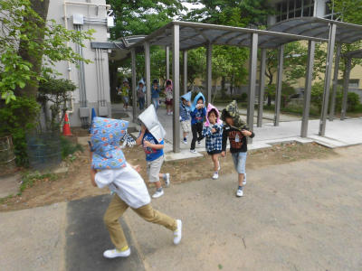 今回は地震が起きた場合の訓練でした。防災頭巾をかぶり避難します。