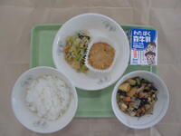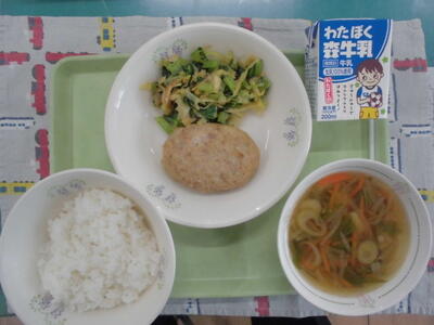 今日のメニューは、ごはん、牛乳、根菜ハンバーグ、みそ和え、沢煮案です。