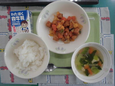 今日のメニューは、ごはん、牛乳、酢豚、チンゲン菜のスープです。