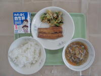 今日のメニューは、ごはん、牛乳、さんまのかば焼き、みそ和え、沢煮椀です。