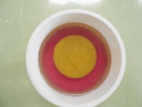 今日は【お月見献立】の日です。メニューは、ごはん、牛乳、豚肉のつけ焼き、小松菜のごま和え、団子汁、お月見ゼリー(下の写真)です。