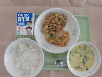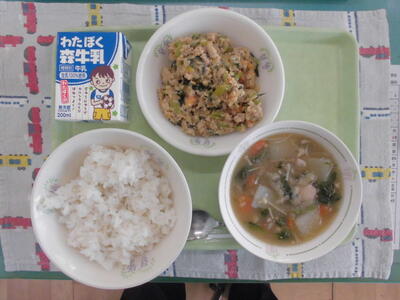 今日のメニューは、ごはん、牛乳、ささみのレモン煮、みそ和え、田舎汁です。