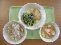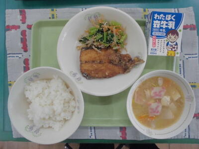 今日のメニューは、さつまいもごはん、牛乳、ほっけのみりん焼き、小松菜の生姜醤油和え、豚汁です。
