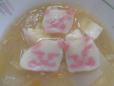 今日のメニューは、ごはん、牛乳、ほっけのみりん焼き、みそ和え、鏡開き雑煮です。