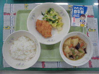 今日のメニューは、ごはん、牛乳、鶏肉のゆず風味揚げ、小松菜ともやしの和え物、芋炊きです。