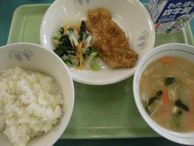 26日の給食は、ごはん、牛乳、さばの竜田揚げ、小松菜のごまあえ、みそ汁、でした。