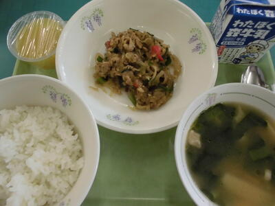 25日の給食は、たけのこごはん、牛乳、とり肉のから揚げ、ごま酢あえ、みそ汁、でした。