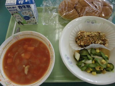 22日の給食は、パインパン、牛乳、イカのパフ焼き、アスパラサラダ、ミネストローネ、でした。