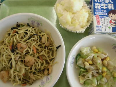 今日のメニューは、上海焼きそば、牛乳、さつまいもと大豆のかりん、チンゲン菜のスープです。