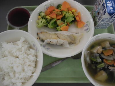 2日の給食は、ごはん、牛乳、たらの西京焼き、ブロッコリーの醤油和え、根菜汁、春日部産ブルーベリーセリー、でした。