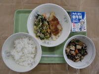28日の給食は、ごはん、牛乳、あじの梅焼き、ごま酢和え、生揚げのそぼろ煮、でした。