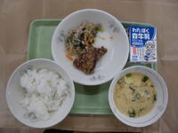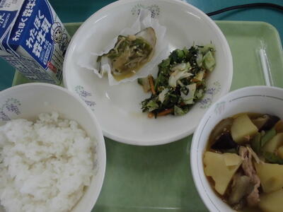 25日の給食は、たけのこごはん、牛乳、とり肉のから揚げ、ごま酢あえ、みそ汁、でした。