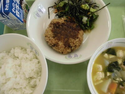 21日の給食は、ごはん、牛乳、蓮根ハンバーグ、切り干し大根の和え物、田舎汁、でした。