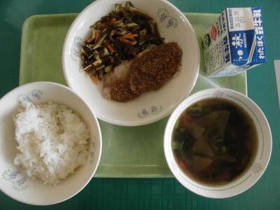 19日の給食は、ごはん、牛乳、ハンバーグ、ひじきのサラダ、野菜スープ、でした。
