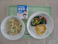 今日のメニューは、チャーハン、牛乳、ささみの包み揚げ、ひじきとツナのサラダ、ヨーグルトです。