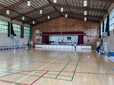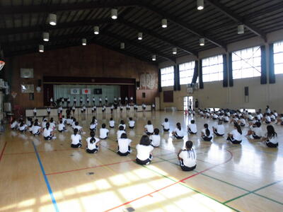 ( ↓ 体育館には、2・3・5年生が集まりました。)