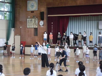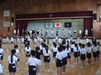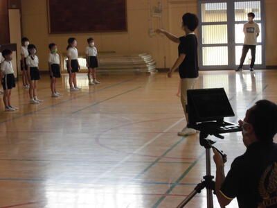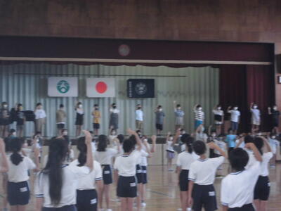 今日の朝は、音楽朝会。感染症防止に気をつけて、全校を二つに分けて、半分は体育館で、半分は教室でリモートでおこないました。